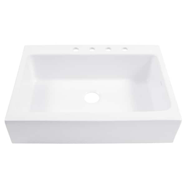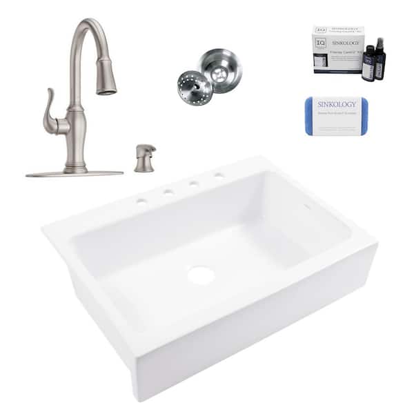 Josephine 34 in. 4-Hole Quick-Fit Farmhouse Drop-in Single Bowl White Fireclay Kitchen Sink with Maren Faucet Kit