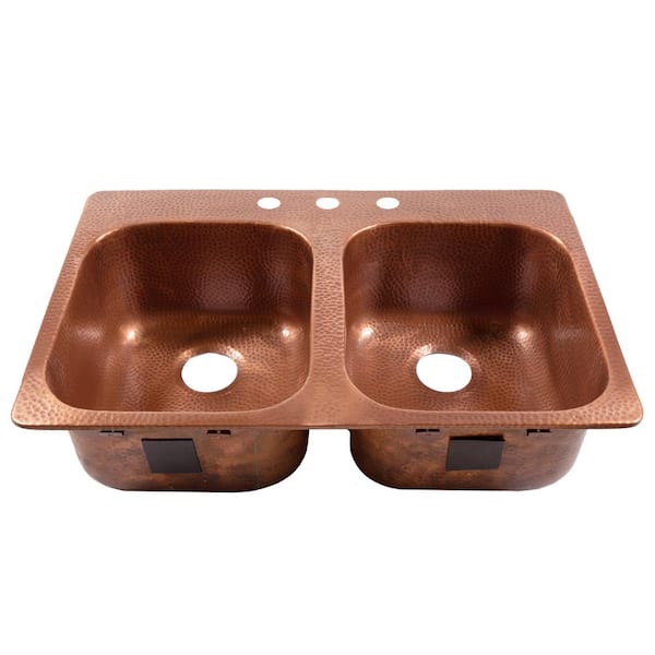 Santi 33 in. 1-Hole Drop-In Double Bowl 16-Gauge Antique Copper Kitchen Sink with Port Haven Bronze Faucet Kit