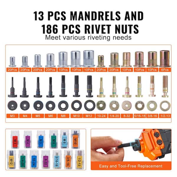 16 in. Rivet Nut Tool, 13PCS Metric and SAE Mandrels, 186PCS Rivet Nuts, Semi-auto Retraction, M3-M12,1/4-20 to 10-24