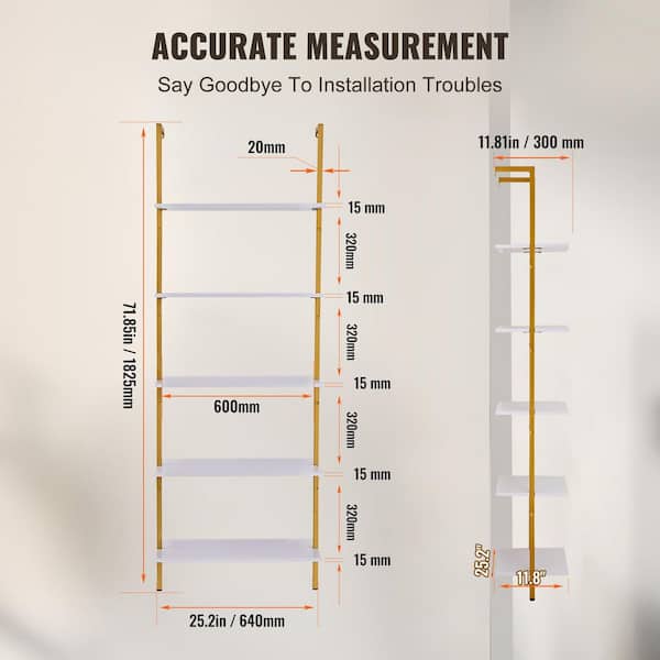 5-Tier Industrial Pipe Shelf, 11.81 in. W x 25.2 in. DGold White Wood Solid Decorative Wall Shelf, Wall-Mount Rustic