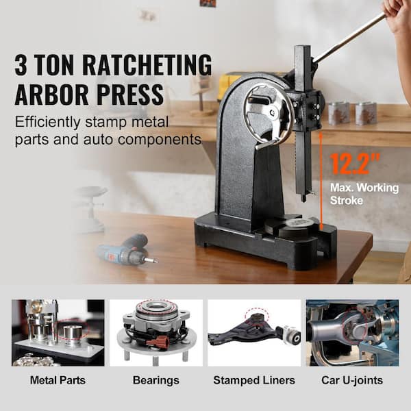 Arbor Press, 3 T Ratchet Type Arbor Press, Ratchet Leverage Arbor Press with Handwheel, 12.2 in. Maximum Height