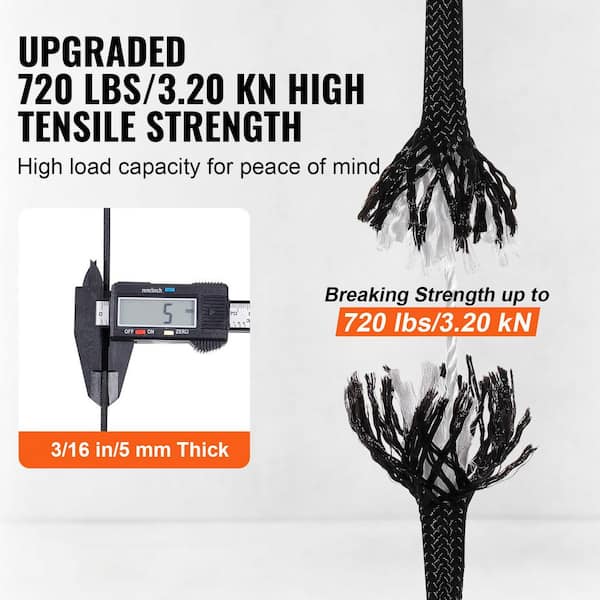 Braided Nylon Cord, Polyester 3/16 in. 4.72 ft. length 720 lbs. Tensile Strength, Multi-Purpose Black Rope, Woven