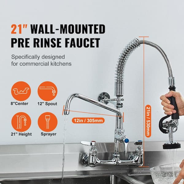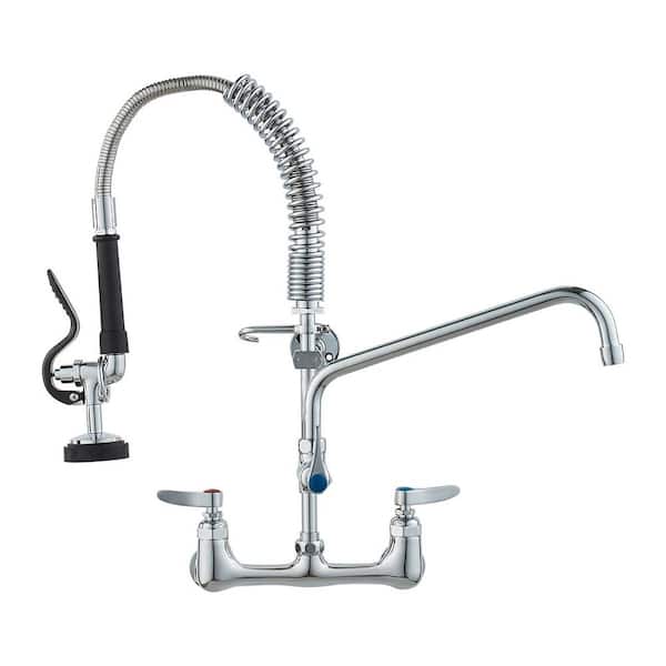 Commercial Wall Mount Triple Handle Pull Down Sprayer Kitchen Faucet with Pre-Rinse Sprayer Stainless Steel