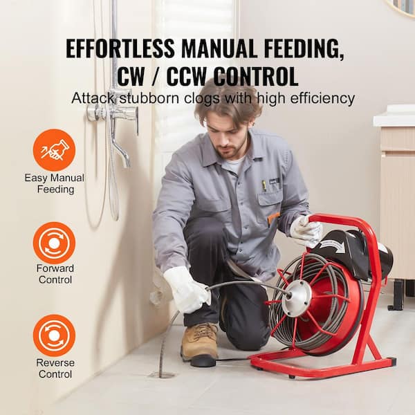 Drain Cleaner Machine 50FT. x 3/8 in. Sewer Snake Auger Manual Feed 250W Electric Drain Cleaning Machine with 4 Cutters