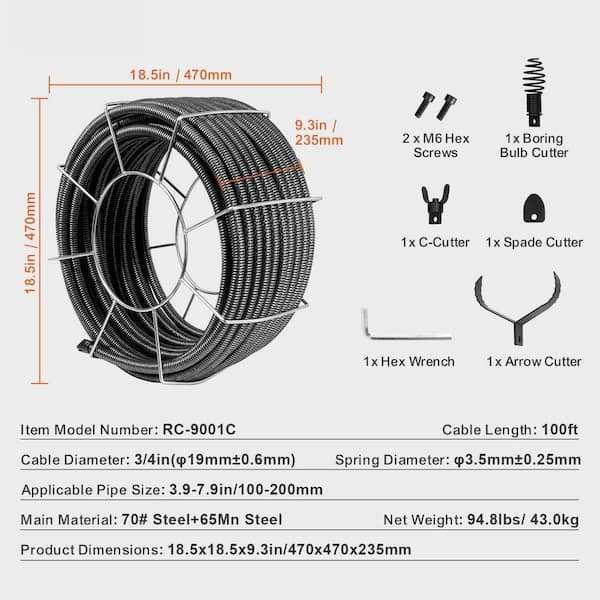 Drain Cleaning Cable 100 FT. x 3/4 in., Solid Core Steel Drain Cleaner Cable with 4 Cutters for 3.9 in. to 7.9 in. Pipes