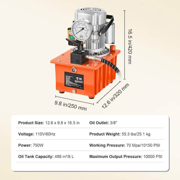 Electric Hydraulic Pump, 10000 PSI 750W 110V, 488 in³/8L Capacity, Single Acting Manual Valve, Driven Hydraulic Pump