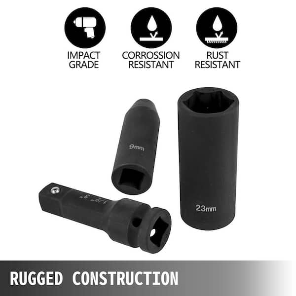 • Impact socket set features a 6-point, high-torque design