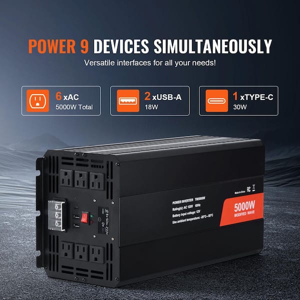 Modified Sine Wave Inverter 5000W DC 12-Volt to AC 120-Volt Power Inverter with 6 AC Outlets 2-USB Port 1 Type-C Port