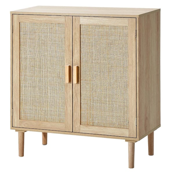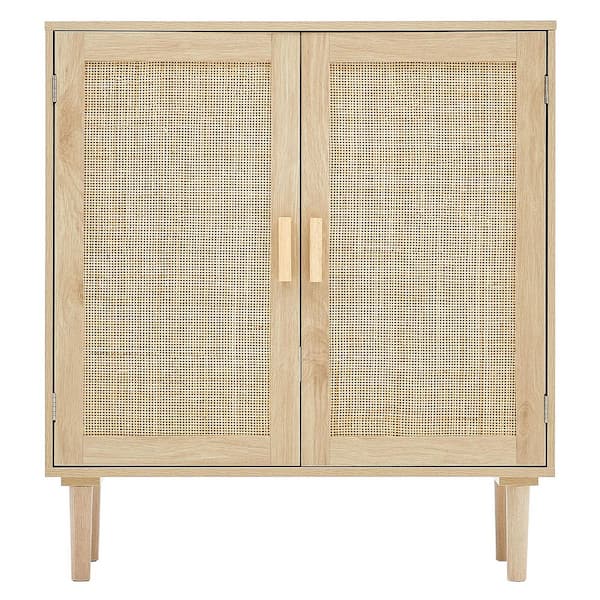 Rattan Cabinet, Rattan Storage Cabinet with 2 Magnetic Doors and Adjustable Shelves, Sideboard Cabinet Natural Wood
