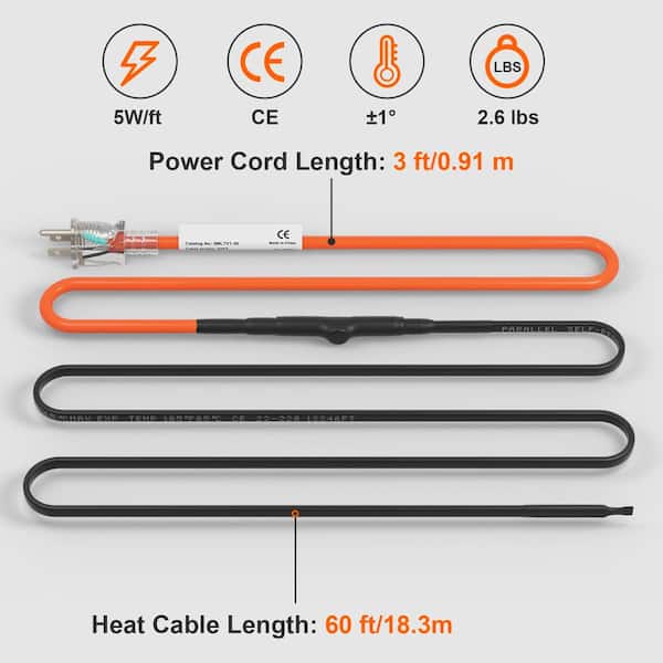 Self-Regulating Pipe Heating Cable, 60 ft. 5W/ft. Heat Tape for Pipes Freeze Protection, Protects PVC Hose