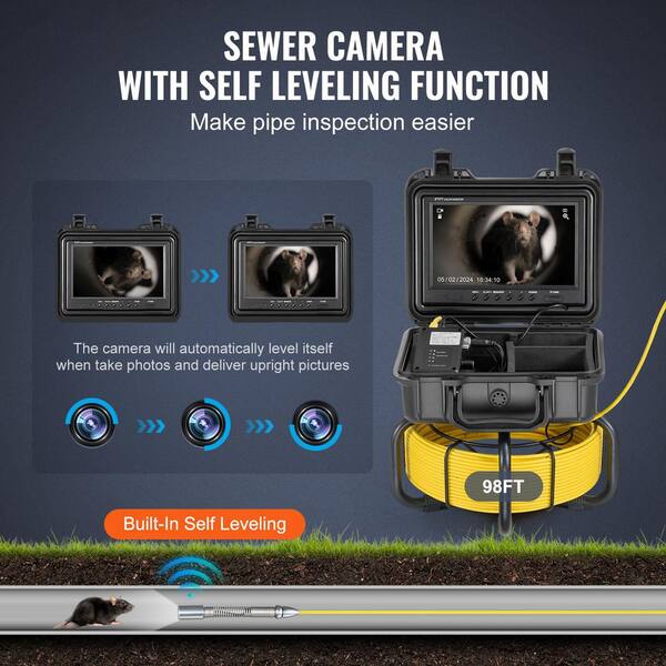 Sewer Camera, 98 ft. /30m, Self-Leveling Drain Inspection Camera with 9in. 1080P HD Screen, 36X Zoom IP68 Sewer Camera
