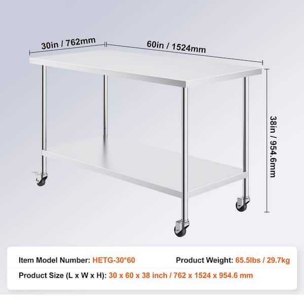 Stainless Steel Work Table Silver Kitchen Prep Table 30 x 60 x 38 In, with 4 Wheels, 3 Adjustable Height Levels