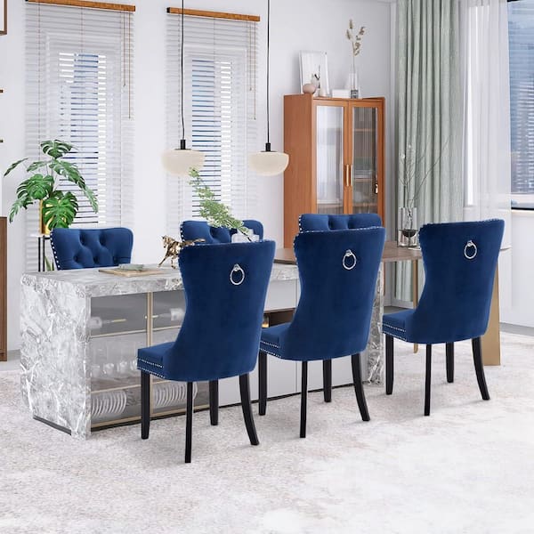 Blue Velvet Upholstered Dining Chair (Set of 6) Wing Back Parsons Chair with Nailhead Trim Soild Wood Legs