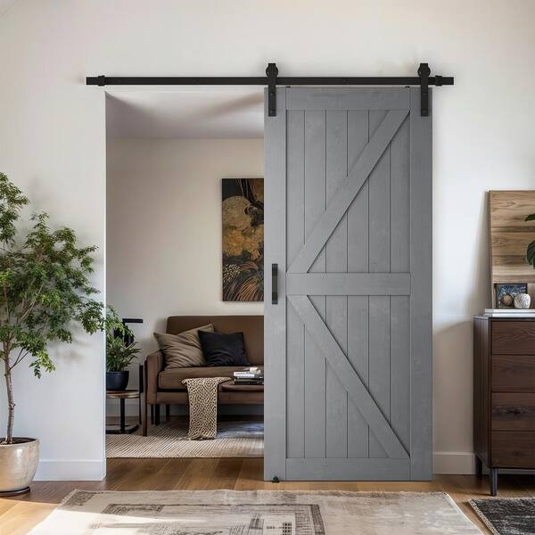 34 in. x 84 in. Grey Wood K-Shaped Natural Solid Finished Interior Sliding Barn Door with Hardware Kit