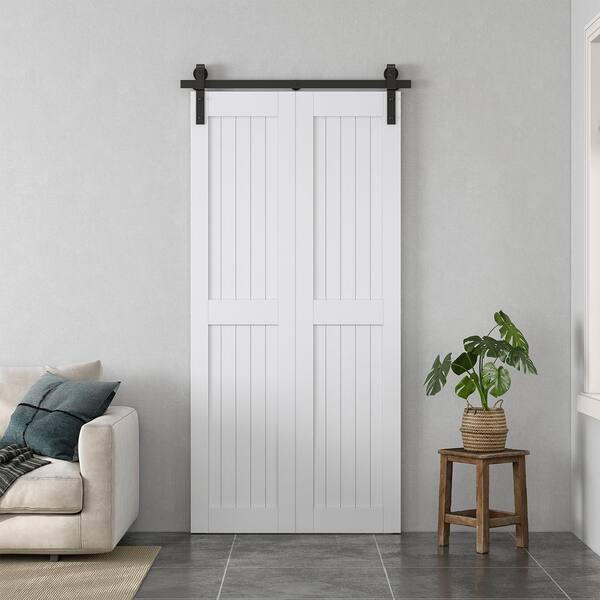 36 in. W. x 84 in. 2-Plank Prefinished White MDF Bi-Fold Barn Door with Sliding Hardware kit