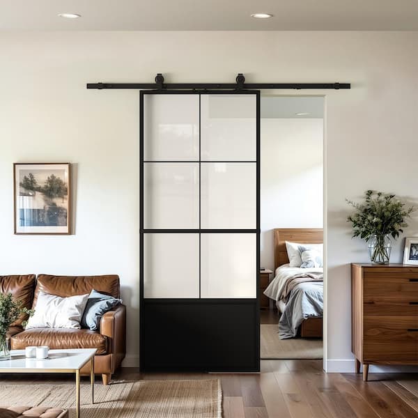 36 in. x 84 in. 3/4-Lite Tempered Clear Glass Black Steel Frame Sliding Barn Door with Hardware Kit and Soft Close