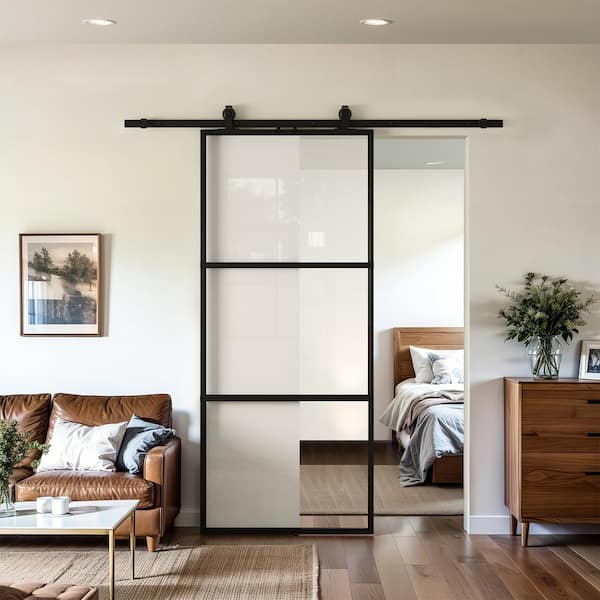 38 in. x 84 in. Full-Lite Tempered Clear Glass Black Metal Frame Interior Sliding Barn Door with Hardware Kit