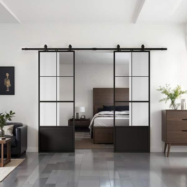 72 in. x 84 in. 3/4-Lite Clear Glass Black Steel Frame Double Sliding Barn Door with Hardware Kit and Soft Close