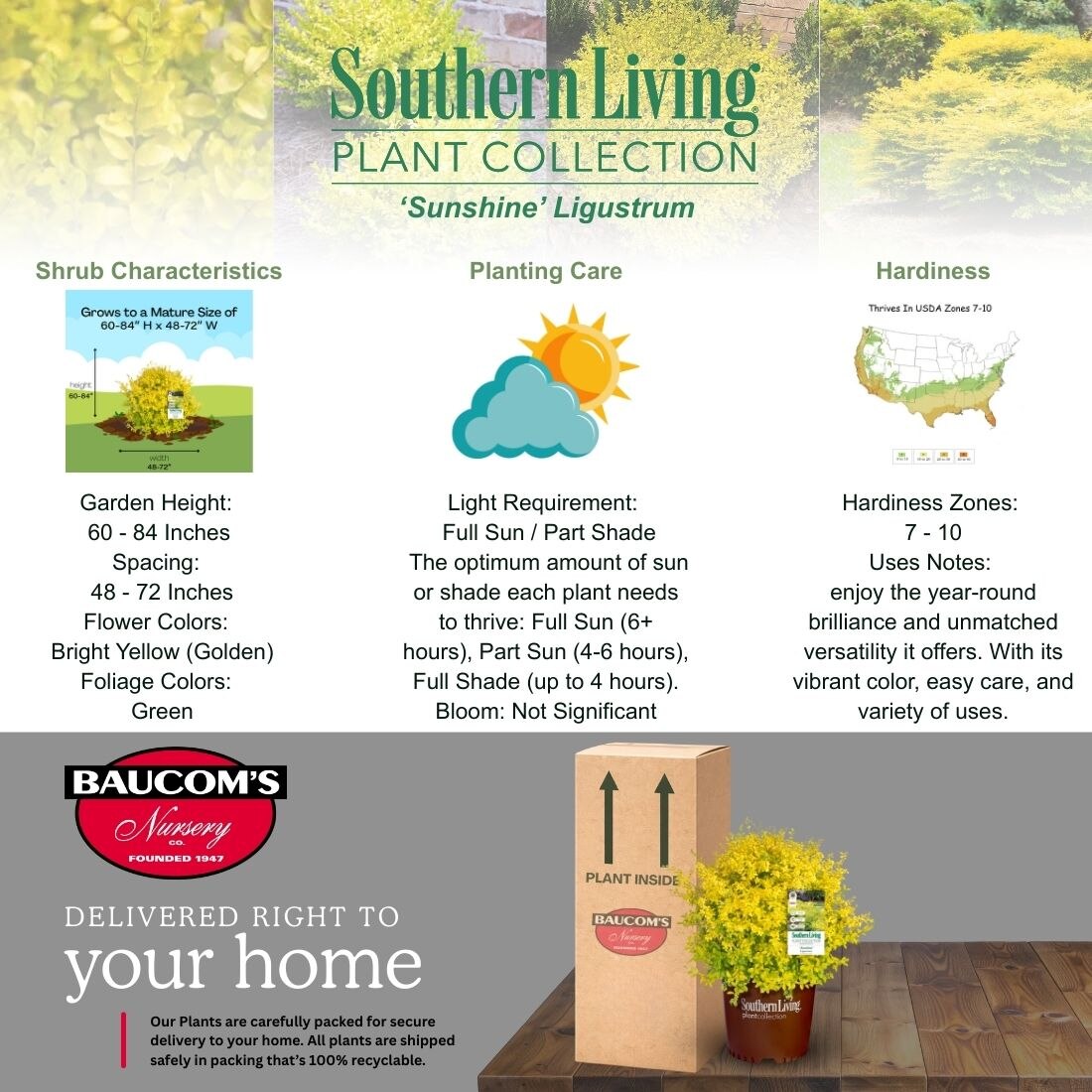 The new Sunshine Ligustrum from the Southern Living Plant Collection completely reinvents the traditional Privet! It's coveted for its vibrant golden-yellow, evergreen foliage. This is a true landscaping treasure, and once you know it, you'll recognize it wherever you see it. New growth emerges as a delicate lime green, which does a phenomenal job of awakening the landscape from its winter slumber. This foliage will continuously intensify as spring turns into summer, at which point they will be a gleaming shade of gold. The more sunlight they get, the better. More sun produces more yellow leaves, while less sun results in more yellow-green foliage. This Ligustrum proves itself to be incredibly versatile. Its compact and upright form makes for a tremendous natural hedge, no pruning required! At maturity, it reaches only 3-4′ wide by 3-6′ tall. Consequently, it also lends itself to trimming, if that's more your speed. Shape this beauty into uniform hedges or small topiaries. Furthermore, the Sunshine's petite, oval leaves are perfect for shaping into hard edges. Try a mass planting for a truly impressive display!