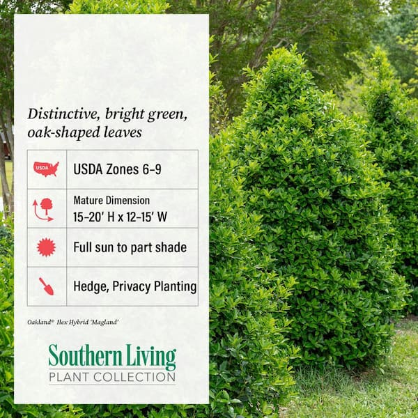 • Oakland Holly has distinctive bright evergreen oak-shaped leaves