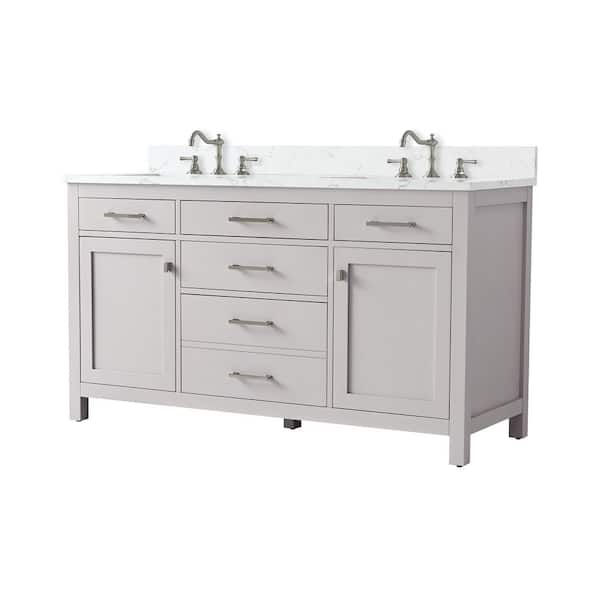 Jasper 60 in. W x 22 in. D Bath Vanity in Taupe with Engineered Stone Vanity Top in Carrara White with White Sinks