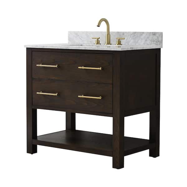 Windwood 36 in. W x 22 in. D Bath Vanity in Brown Oak with Natural Marble Vanity Top in Carrara White with White Sink