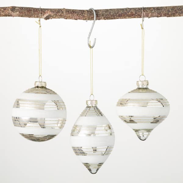 4 in. 4.75 in. and 5.25 in. White Striped Drop Ornaments - Set of 3, White Christmas Ornaments
