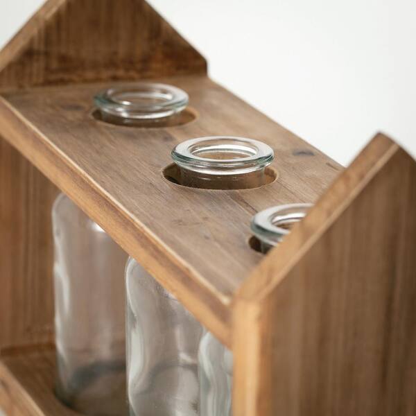 7" Glass Cylinder Bottle Vases With Wood Stand, Brown