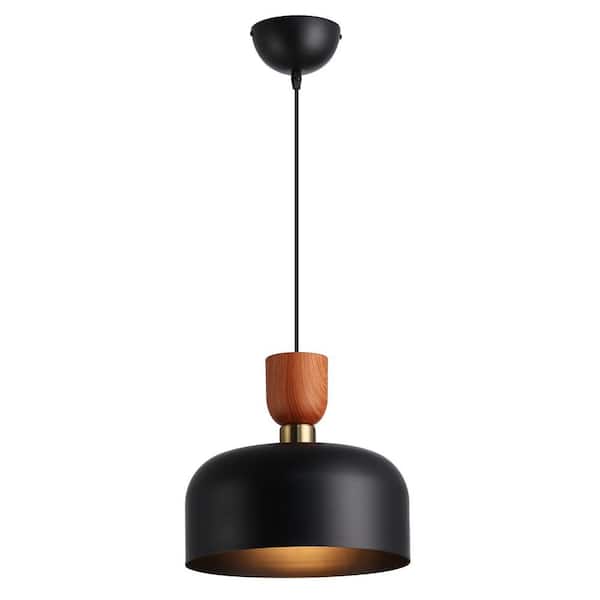 Industrial 11.8 in. 1 Light Black Wood Dome Pendant Light, Height Adjustable LED Reading Chandelier, E26 Socket