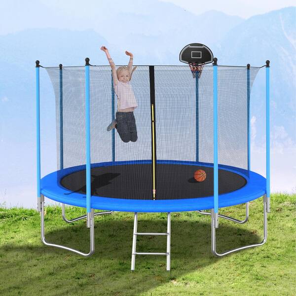 10 ft. Blue Round Trampoline with Safety Enclosure Net and Basketball Hoop