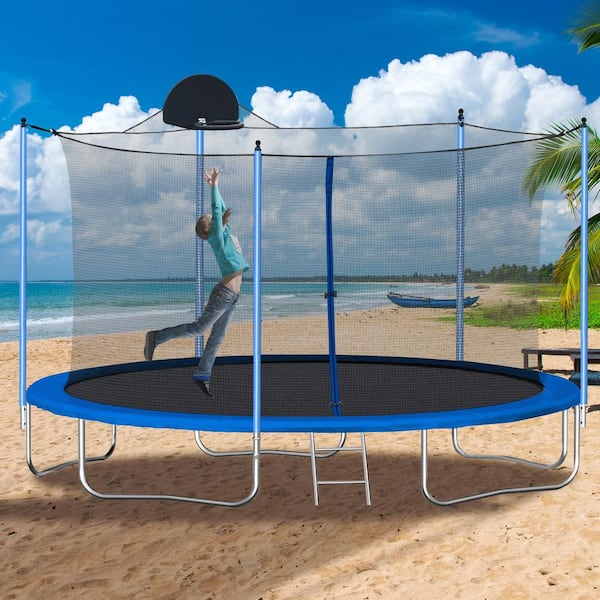 12 ft. Blue Round Outdoor Trampoline with Safety Enclosure and Basketball Hoop