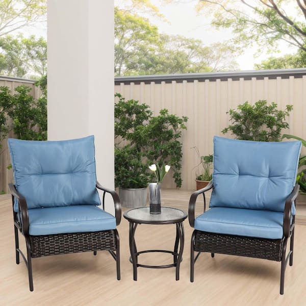3-Piece Black Wicker Outdoor Bistro Set with Blue Cushion