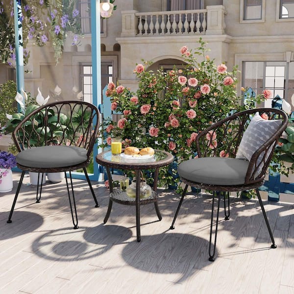 3-Piece Brown Wicker RoundTable Outdoor Bistro Set with Grey Cushion