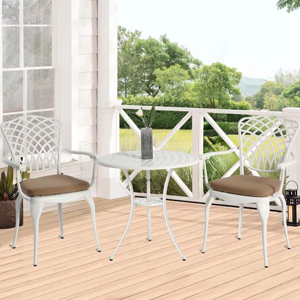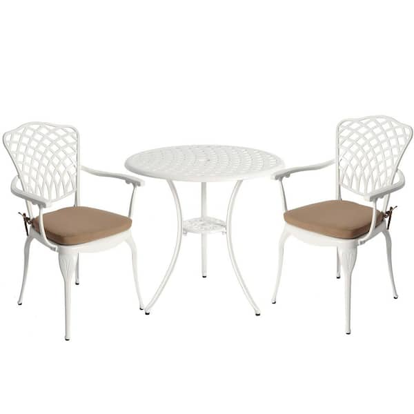 3-Piece White Cast Aluminum Round Table Outdoor Bistro Set with Umbrella Hole and Cushion