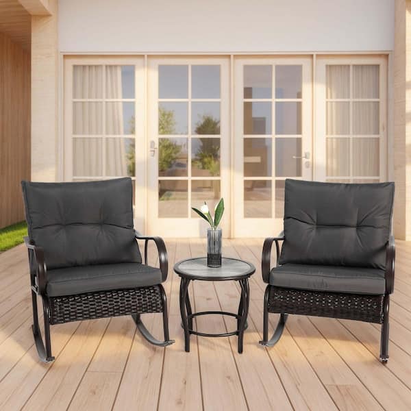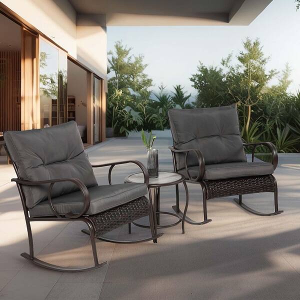 3-Piece Wicker Patio Conversation Seating Set with Coffee Table with Grey Cushions