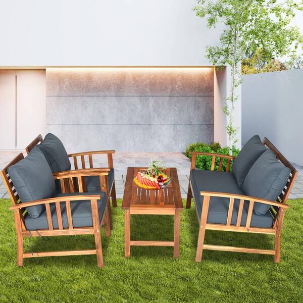 4-Piece Wooden Patio Conversation Set with Gray Chair Cushioned Garden