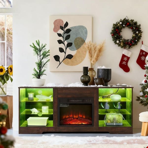 58 in. W Freestanding Wooden with LED Lights and USB Charging Outlet 3D Electric Fireplace TV Stand in Espresso