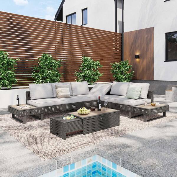 6-Piece Wicker with Extendable Coffee Table Patio Conversation Set with Grey Cushions