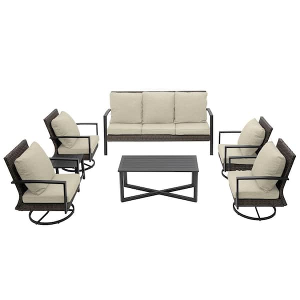 7-Person Outdoor Wicker Patio Conversation Seating Set with Beige Cushions and Tables