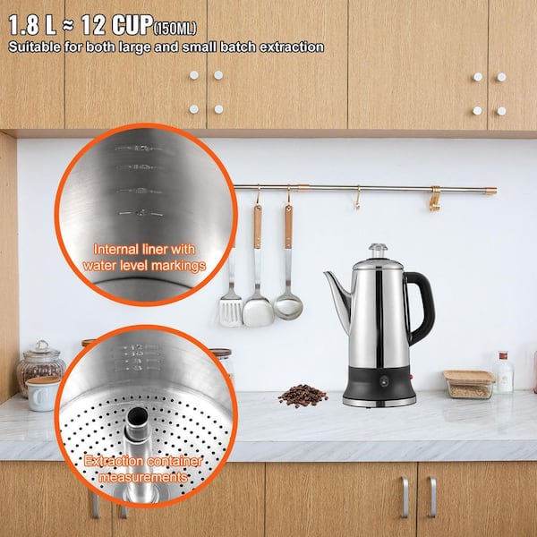 • 1.8L capacity, can make 12 cups of coffee