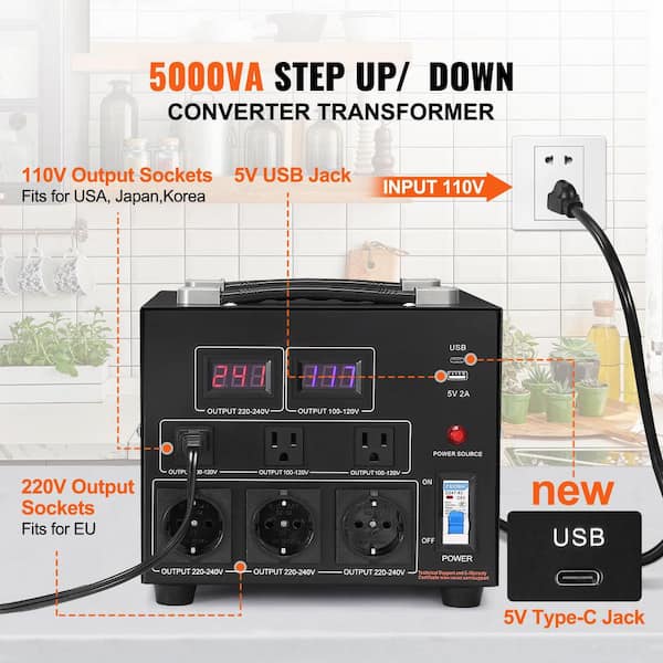5000-Watt Voltage Converter Transformer, Step Up/Down 110-Volt to 220-Volt 5 V USB Port CE Certified Pipe Capacity