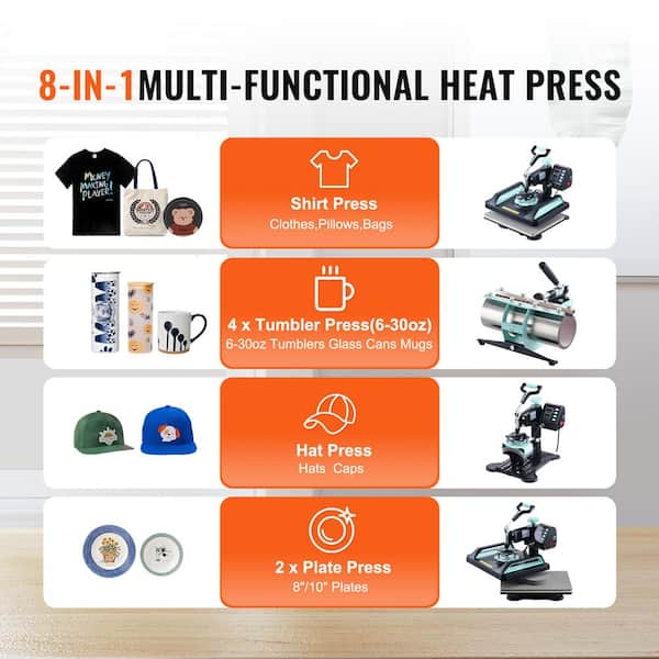 8-in-1 Heat Press Machine, 12 x 15 in., 30 oz. Tumbler Press, 360° Swing Away Digital T-Shirt Press, Teflon Coating