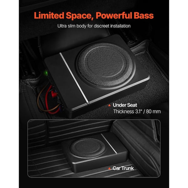 8 in. 240W Underseat Car Subwoofer, Slim Powered Subwoofer, Built-in Amplifier, High/Low Level Input & Volume Controller