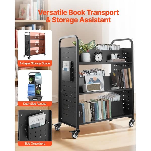 Book Cart, Hand Truck. 330lbs. Capacity, Black. Double Sided W-Shaped Sloped Shelves, 4 in. Lockable Wheels