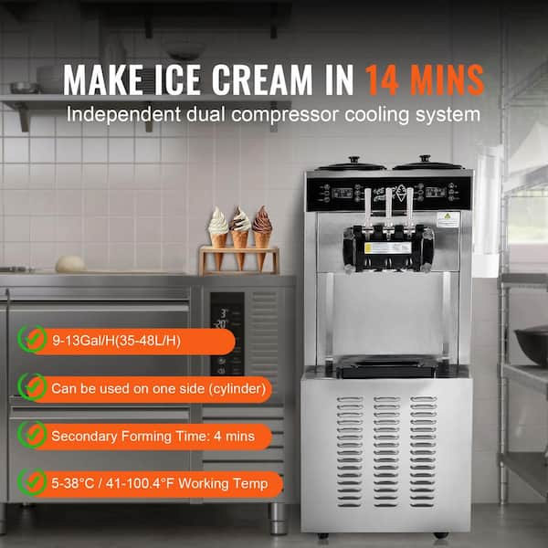 Commercial Ice Cream Machine 34-44 L/H Yield,19 qt. Ice Cream Maker with 3400 W 3-Flavor Soft Serve Maker Silver
