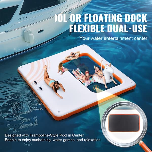 Inflatable Floating Dock, 10 ft. x 10 ft. Platform with 4 ft. x 7 ft. Trampoline Pool, Non-Slip Water Mat