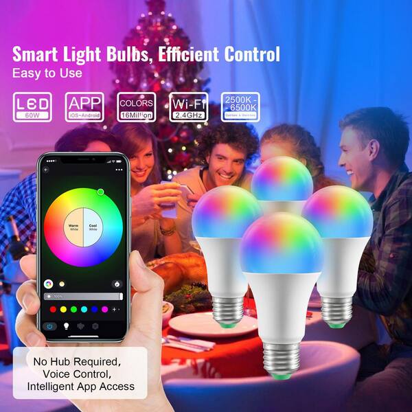 Smart LED Bulbs 4-Pack 9 W Multicolor 800 Lumens A19 Smart Control RGB Color Changing