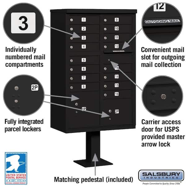 Black USPS Access Cluster Box Unit with 16 A Size Doors and Pedestal