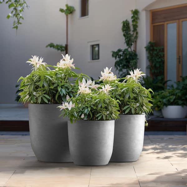 13.5in., 17in., 20.5in. Dia Stone Finish Large Tall Round Concrete Plant Pot / Planter for Indoor & Outdoor Set of 3