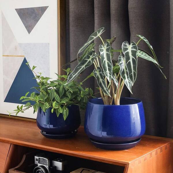 Sapphire Blue Ceramic Indoor/Outdoor Plant Pot with Drainage Hole and Saucer (3-Pack)